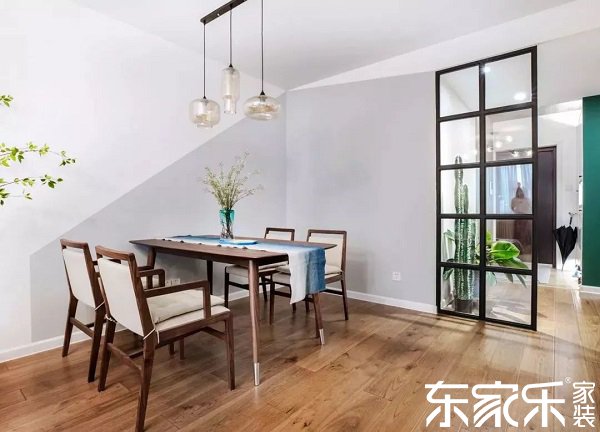 玄關(guān)與客餐廳之間,通過一扇黑色框架玻璃門隔斷,讓家的擴(kuò)展性更強(qiáng),餐廳胡桃木色餐桌椅加上個(gè)性吊燈,古典與現(xiàn)代的完美結(jié)合。