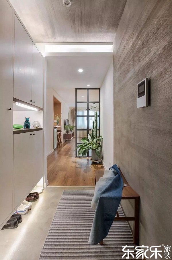 玄關(guān)處右側(cè)空出的區(qū)域設(shè)計(jì)成了一個(gè)衣帽柜,基本可以滿足大部分衣物的收納需求,個(gè)性化的燈具效果讓原本衣柜底部黑暗的區(qū)域變得明亮起來,再也不用擔(dān)心晚上找不到鞋了!