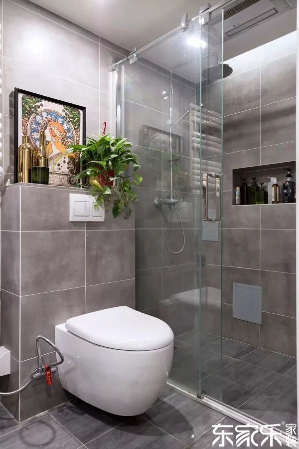干濕分離的設(shè)計(jì),保證了空間的整潔與清爽,墻壁上人性化的空出一個(gè)小空間來擺放潔具用品,以原生的元素解決了收納問題。