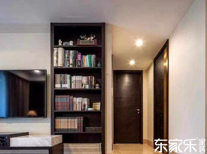 電視柜是和茶幾搭配成套的,電視的旁邊放著一個書架,古香古韻的氣息。
