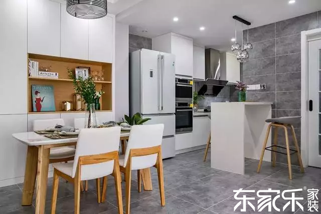 往里走,就到了餐廳,簡單的餐桌椅,配上同款同色系的餐邊柜,實用性瞬間上漲;開放式的廚房設(shè)計,雖然可能存在油煙問題,但是卻節(jié)省了很多空間。