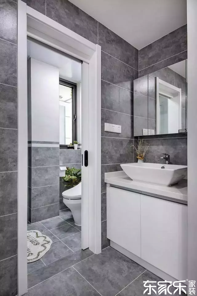 衛(wèi)生間和廚房一樣都是灰色為主調(diào),洗手臺外挪,徹底的干濕分離,不論是顏值還是實用性都很高!