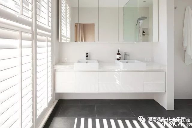除了使用少量顏色外,現(xiàn)代化的大浴室也傾向于使用有限的材料,并在不同的表面上重復(fù)使用這些材料,使整個(gè)空間顯得連貫和諧。