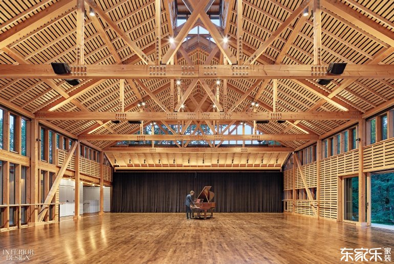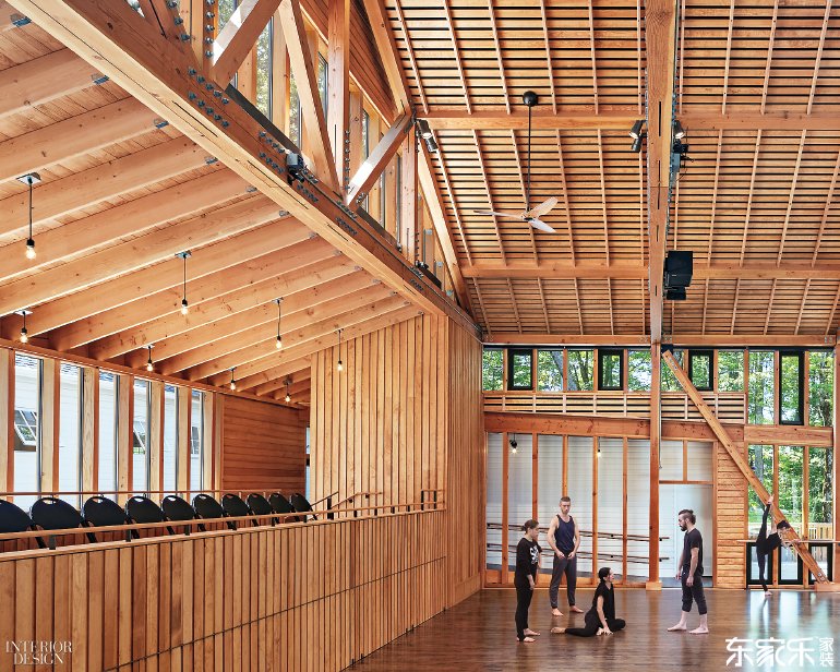 在堅持流行的鄉(xiāng)土風格的同時,該工作室“非常適合我們這個時代”,弗蘭斯堡總裁David Croteau說。傳統(tǒng)谷倉設(shè)計有水晶圓屋頂,環(huán)繞式天窗和兩個窗戶墻?所有這些玻璃讓舞者可以欣賞到伯克希爾山的風景,同樣重要的是,參觀者可以在里面看到舞者們在練習。除玻璃以外,這座面積達7400平方英尺的建筑是一種木結(jié)構(gòu)建筑:外部采用西部紅柏樹,內(nèi)部墻壁和天花板采用道格拉斯冷杉和松木,彈性地板采用染色楓木。梁和桁架支持燈光以及揚聲器系統(tǒng),這對參加者坐下時幾乎是看不見的。順便說一下,座椅解決方案聰明但技術(shù)含量低。為了沿著一側(cè)補充陽臺,從陽臺底部滑出的平臺可以容納額外的折疊椅,在不需要時存放在衣柜中。