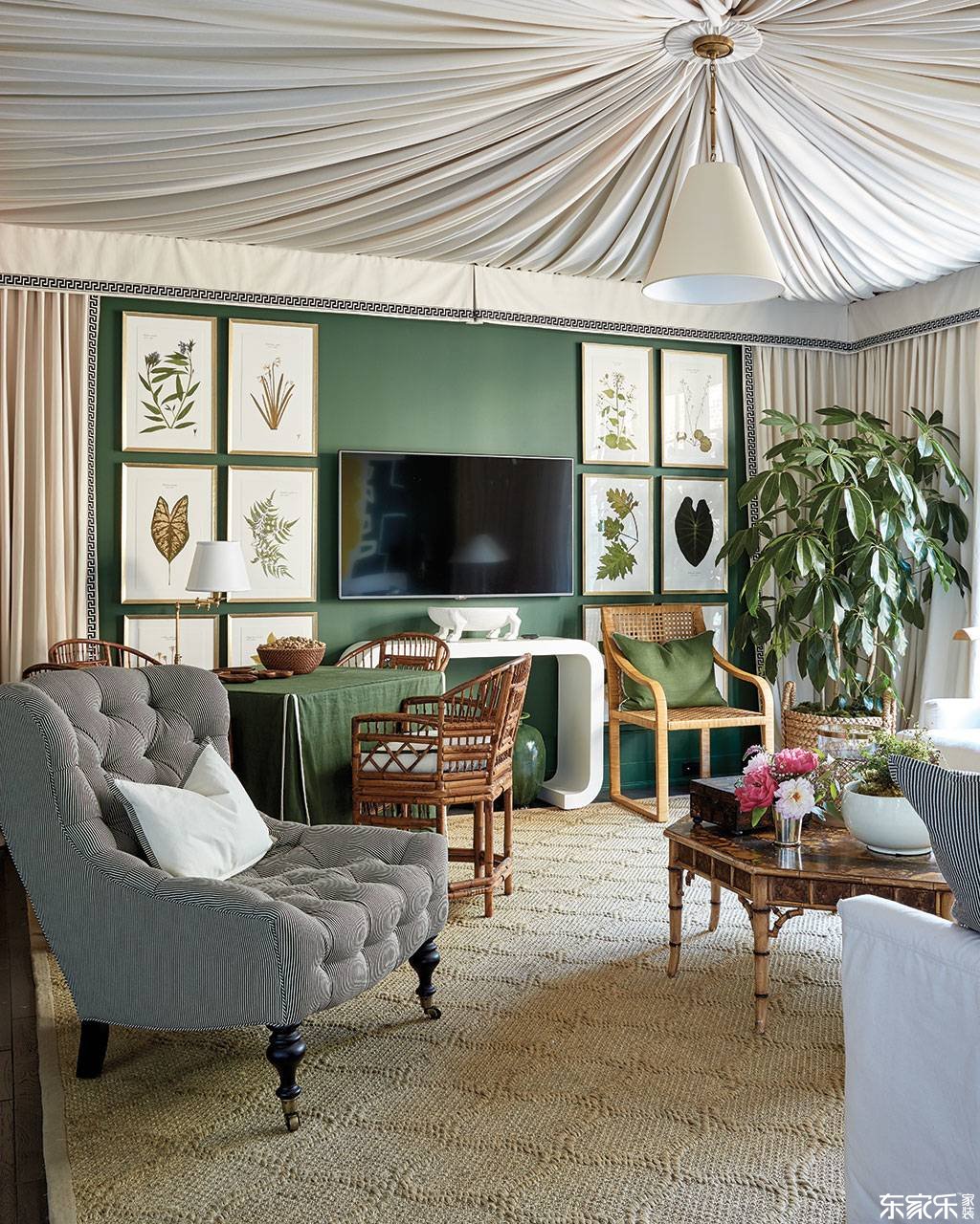 在電視機(jī)周圍創(chuàng)建一些命令,將注意力從屏幕上移開。我們非常喜歡建筑師比爾·英格拉姆(Bill Ingram)在2016年創(chuàng)意之家廚房的保管室里掛上平板電視的方式。 在兩張植物版畫的網(wǎng)格之間,比爾直接將平板安裝在控制臺上的墻上。電視很明顯,但絕不是房間的焦點(diǎn)。